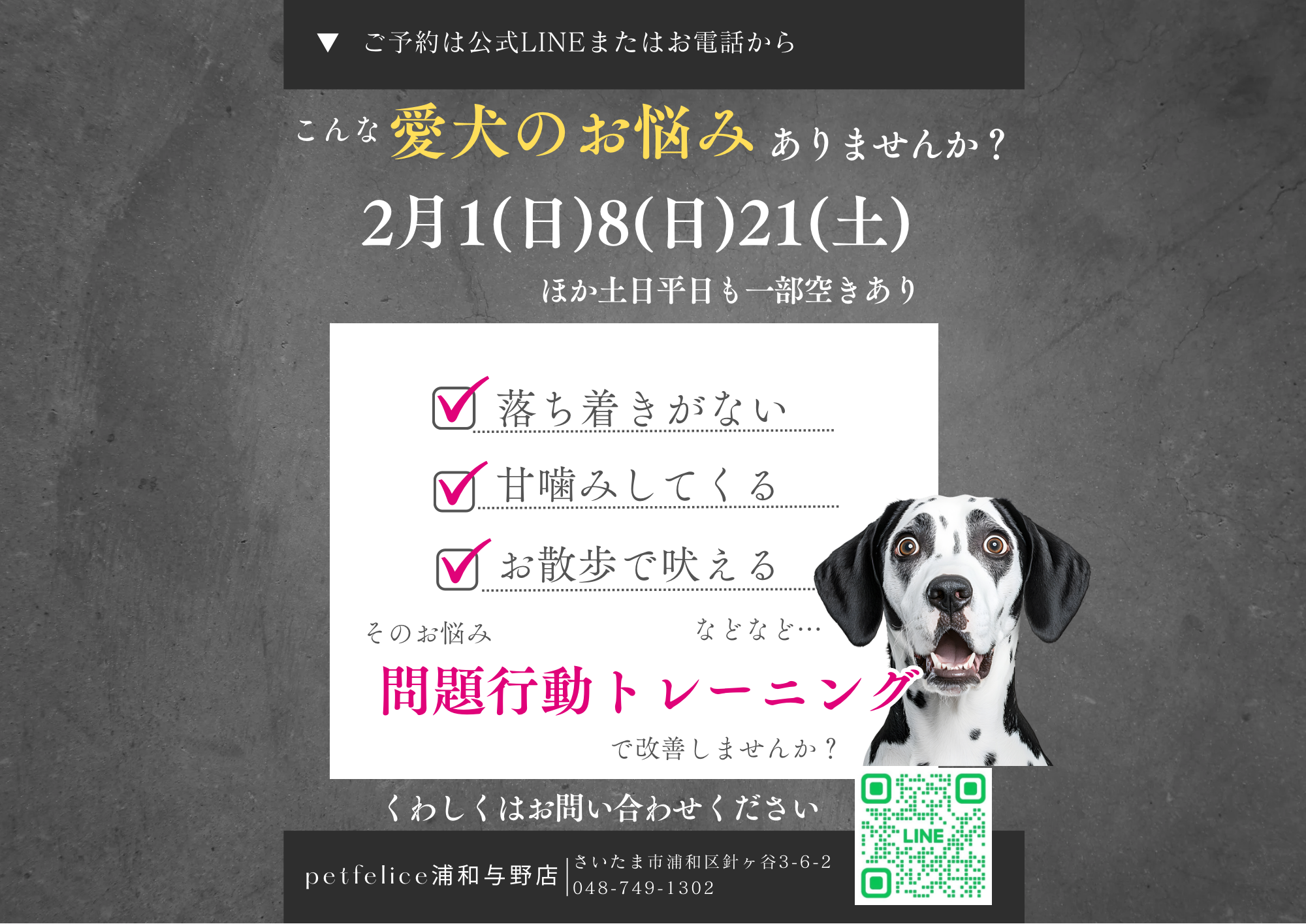 petfelice浦和与野店11月15日、12月6日、20日問題行動トレーニング空き状況