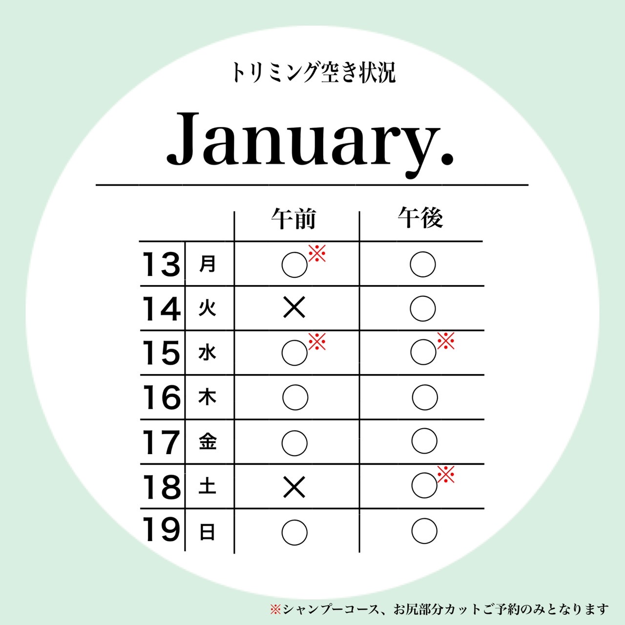 petfelice与野店の1月3週目のトリミング空き状況です😊
