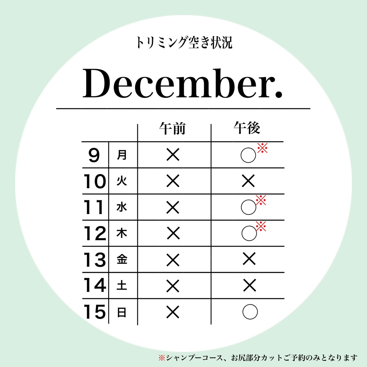 petfelice与野店の12月2週目のトリミング空き状況です😊