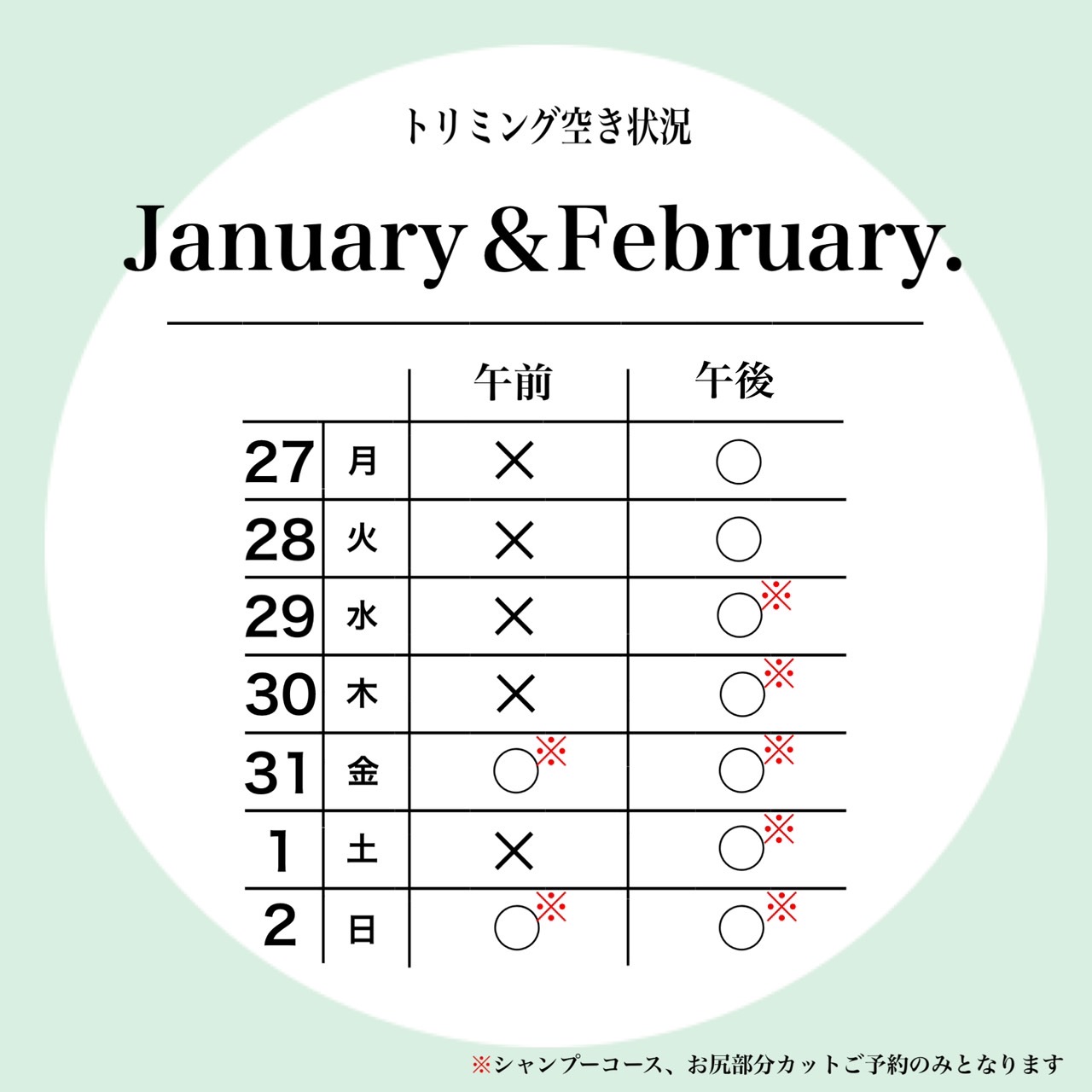 petfelice与野店の1月5週目と2月1週目のトリミング空き状況です😊