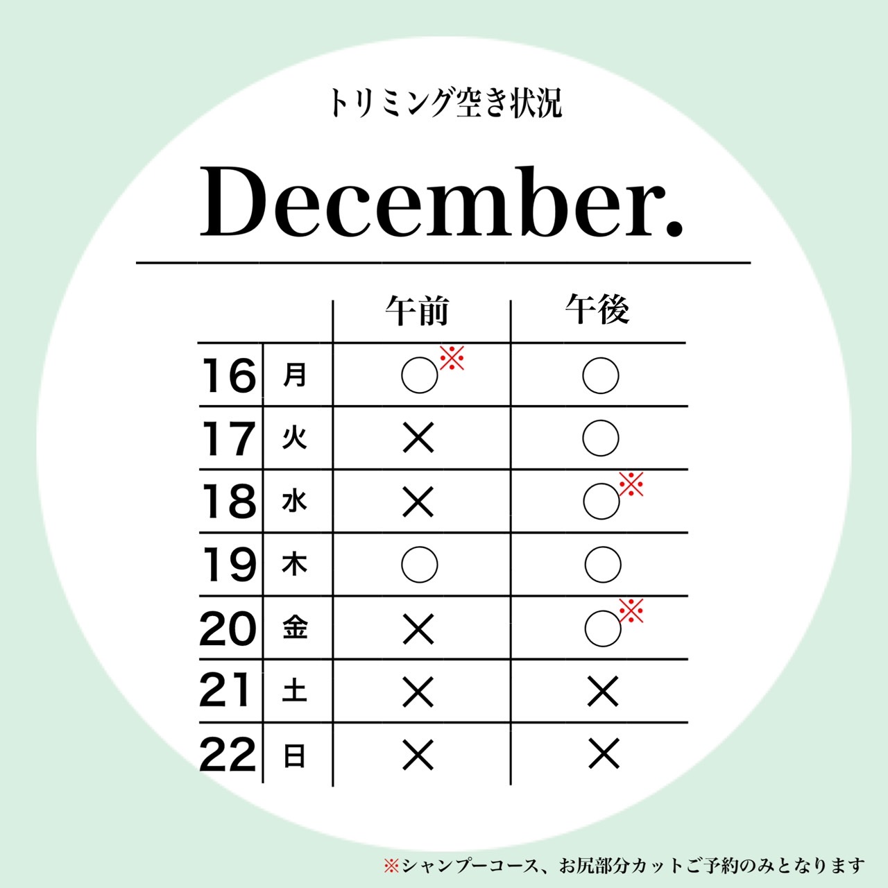 petfelice与野店の12月3週目のトリミング空き状況です😊