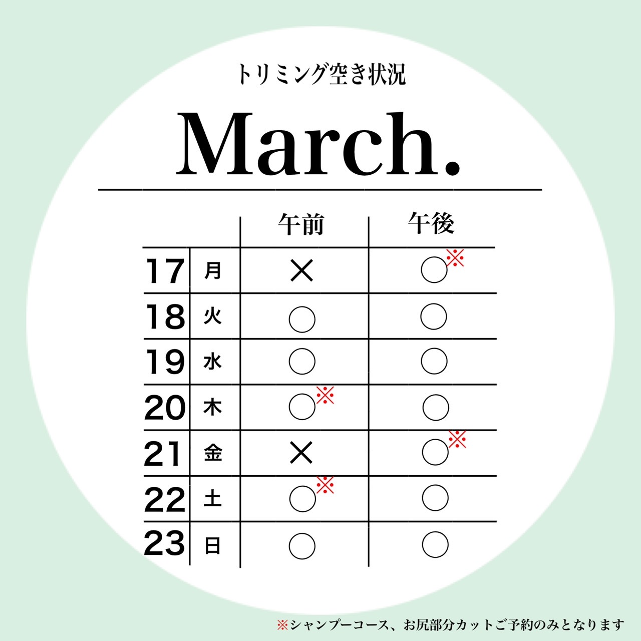 petfelice与野店の3月4週目のトリミング空き状況です😊