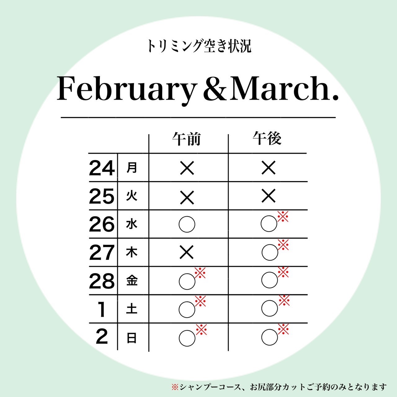 petfelice与野店の2月5週目、3月1週目のトリミング空き状況です😊