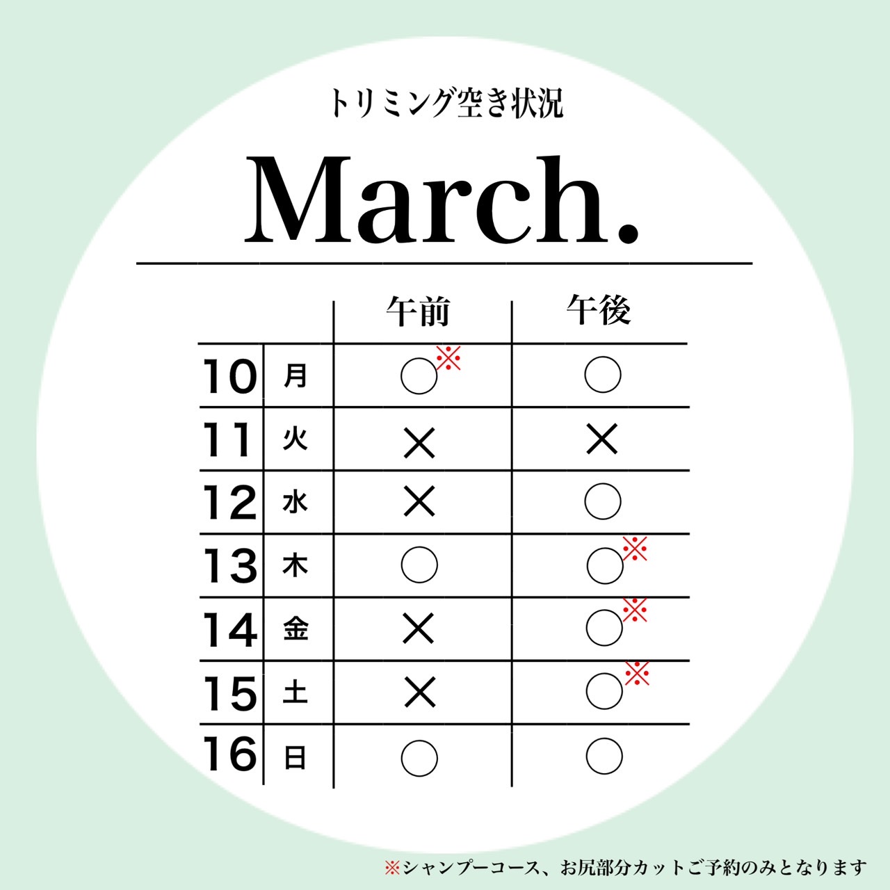 petfelice与野店の3月3週目のトリミング空き状況です😊