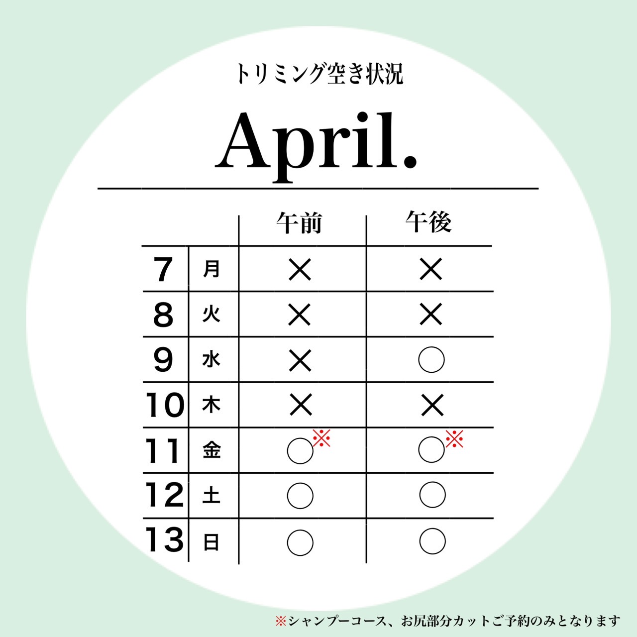 petfelice与野店の4月2週目のトリミング空き状況です😊