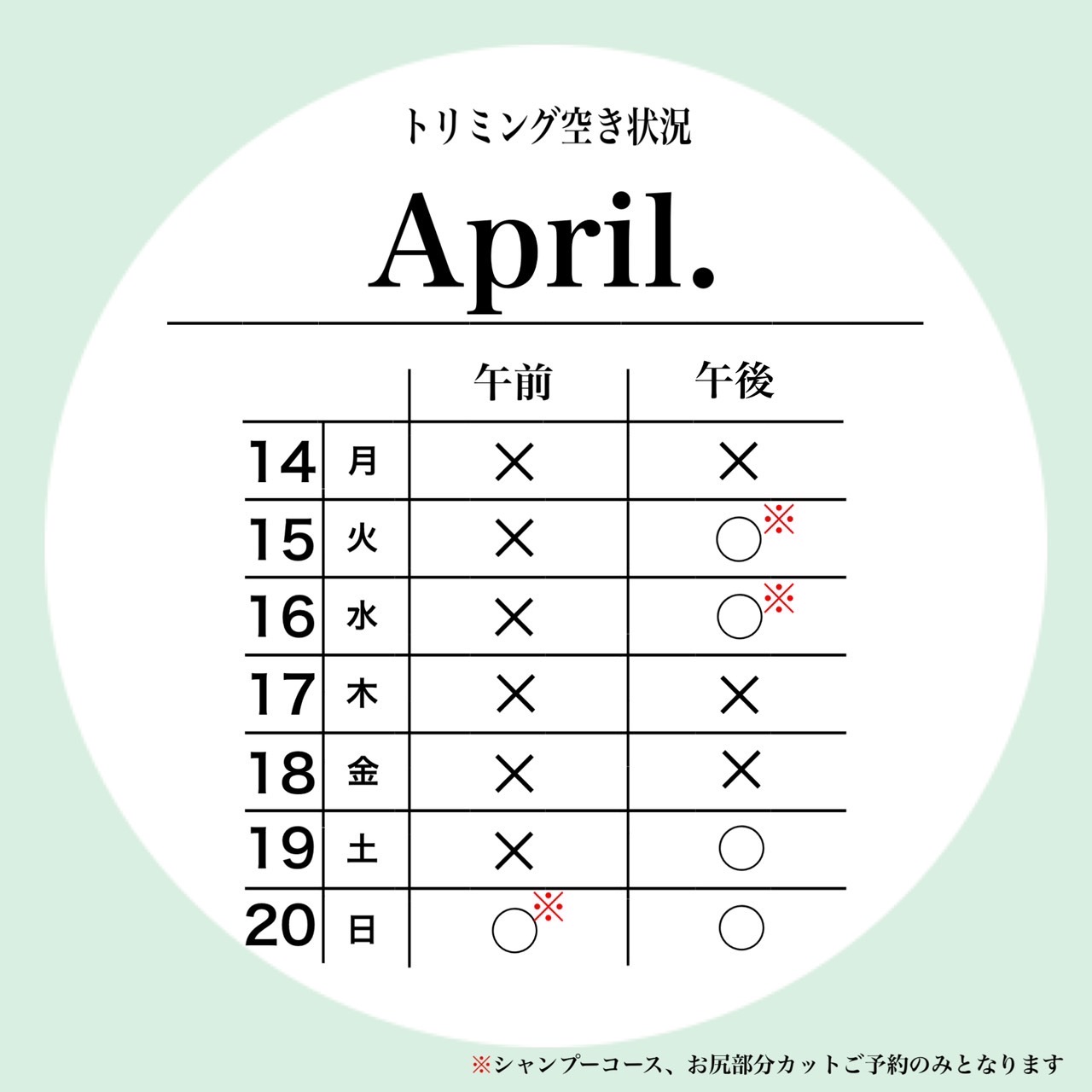 petfelice与野店の4月2週目のトリミング空き状況です😊