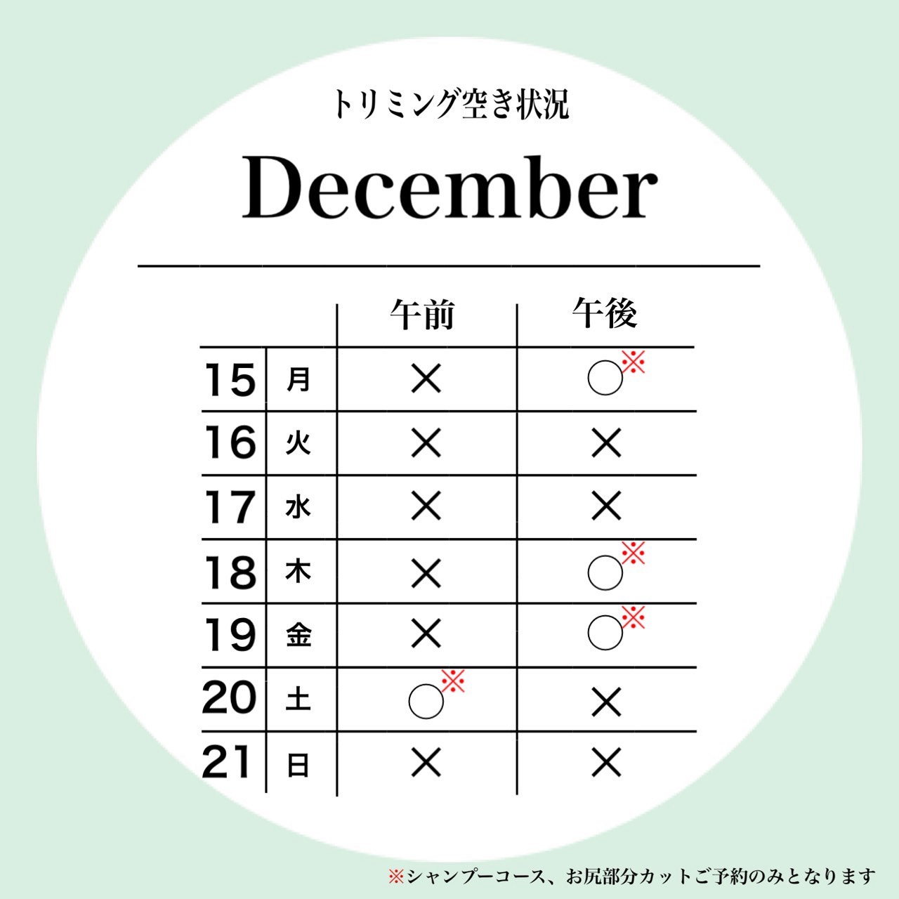 petfelice浦和与野店の12月3週目のトリミング空き状況になります!