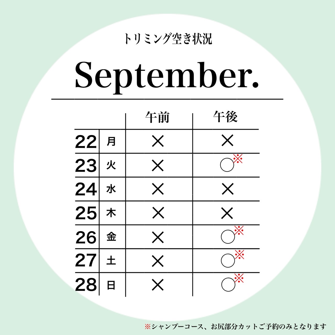 petfelice浦和与野店の9月4週目のトリミング空き状況になります!