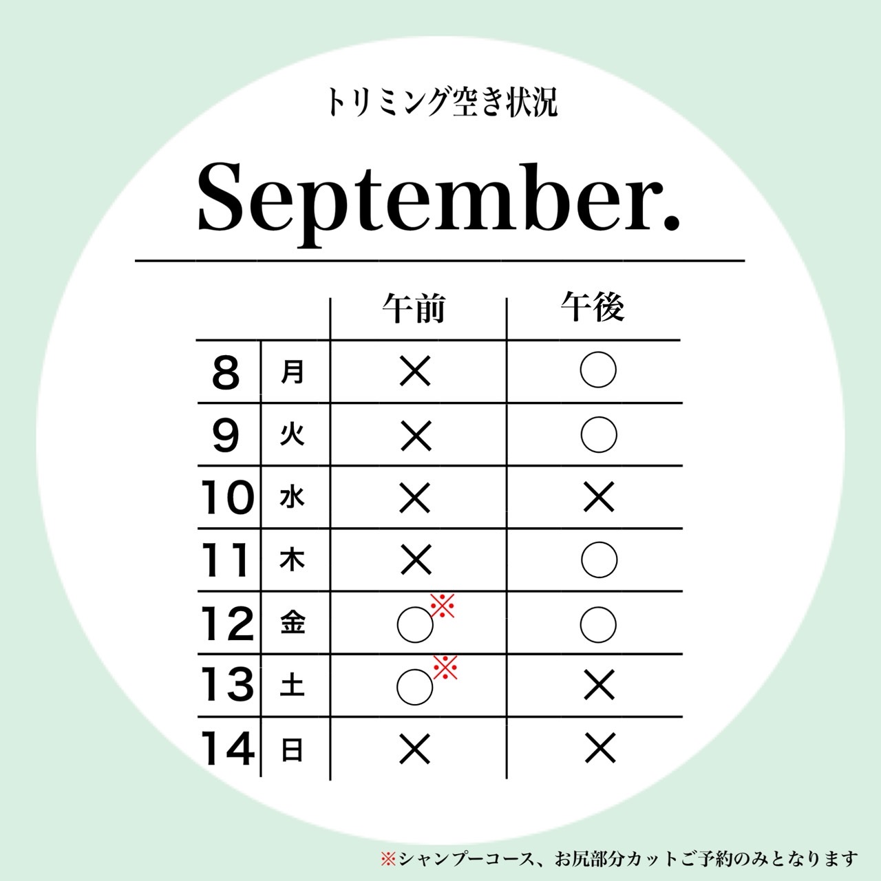 petfelice浦和与野店の9月2週目のトリミング空き状況になります!