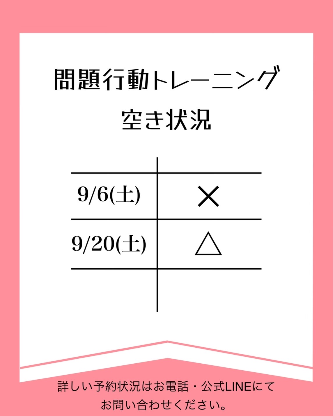 9月6日(土)、9月20日(土)の問題行動トレーニングの空き状況になります!