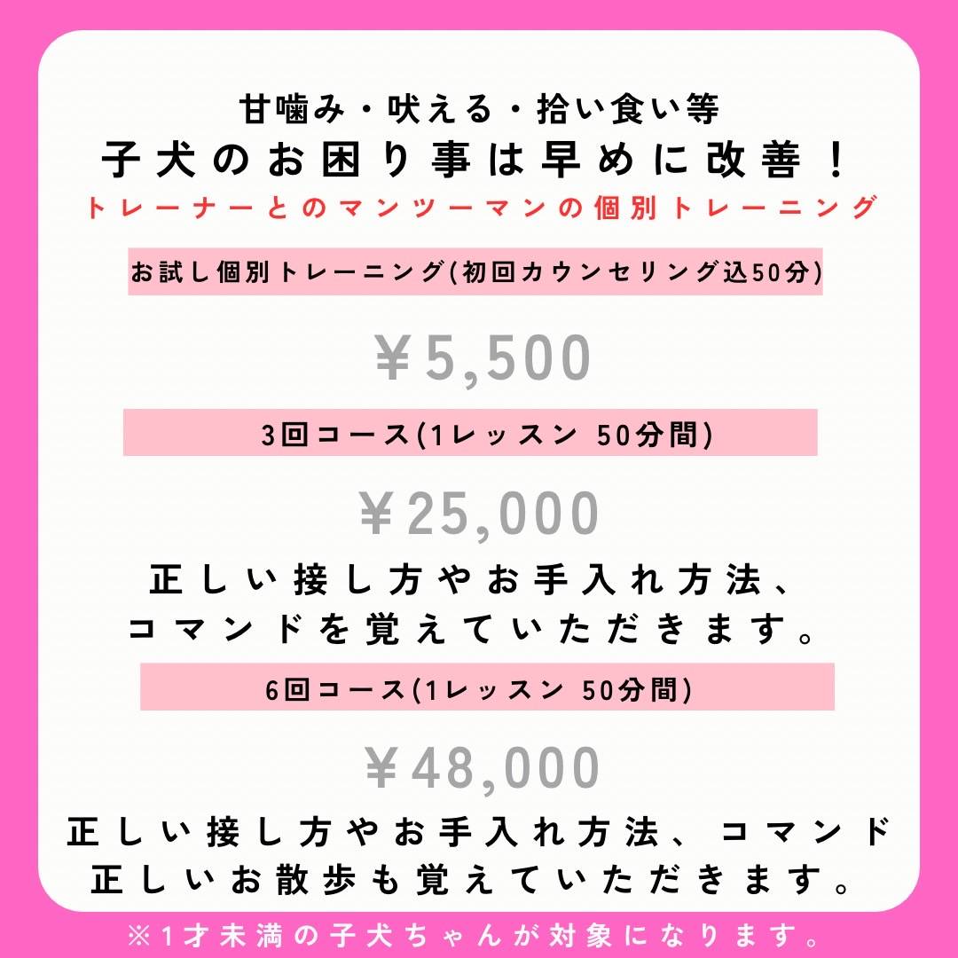 パピーからトレーニングをする事で改善も早く、また問題行動が起こる前の予防トレーニングにもつながります。