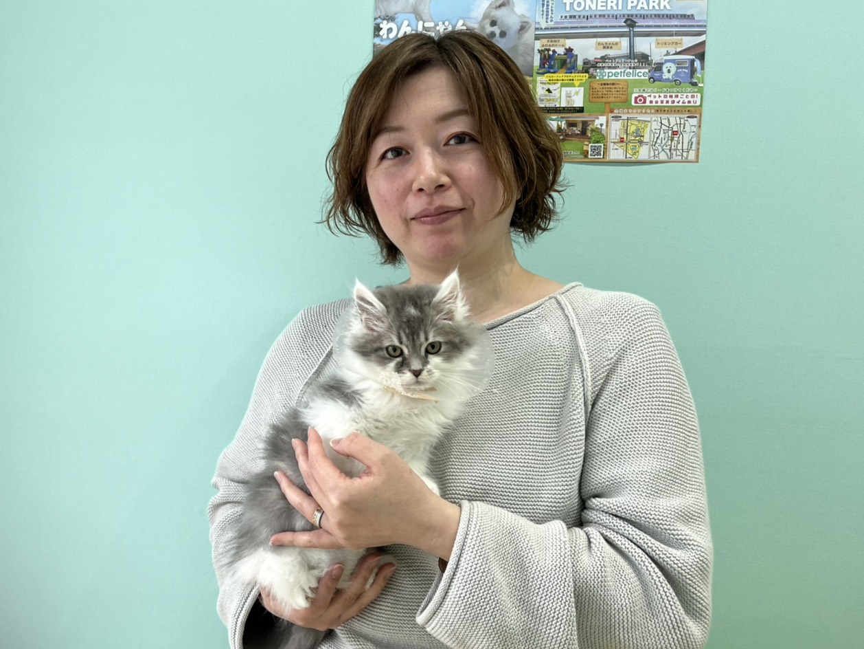 お店に来てから元気いっぱいで、ごはんが欲しい時やかまって欲しい時に、「みゃ〜!」と子猫らしい鳴き声でお知らせしてくれました♪