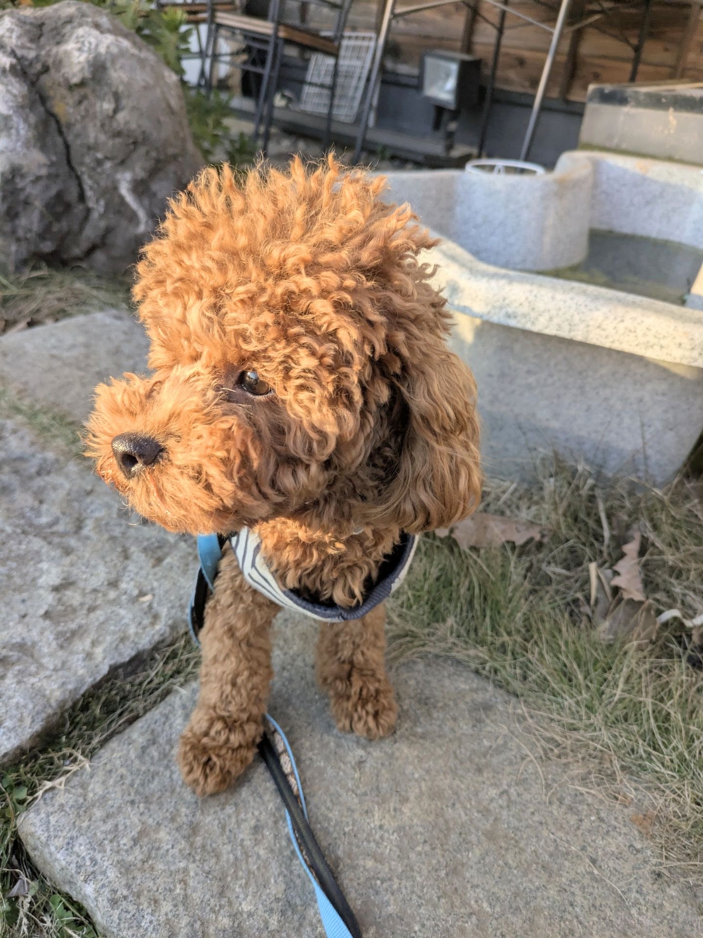 上の前歯がないのですが、ご飯はしっかり食べれます!足腰は丈夫そう。シャンプーカットもとても上手ないい子でした。こげ茶のトイプーさん、珍しいね~。